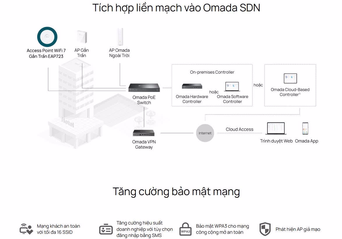 - Bảo mật: Hỗ trợ các chuẩn bảo mật như WPA-Personal/Enterprise, WPA2-Personal/Enterprise, WPA3-Personal/Enterprise, Captive Portal Authentication, Access Control, Rogue AP Detection.
