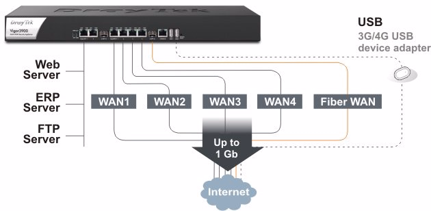 | Port | - 4 × WAN/DMZ 10/100/1000Mbps (RJ-45) - 2 × LAN 10/100/1000Mbps (RJ-45) - 2 × USB 2.0 (Printer/3G/4G) - 1 × Console RJ-45 - 2 × khe SFP (1 WAN, 1 LAN) |
