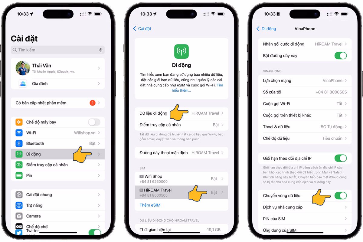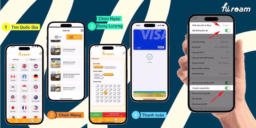 Lắp SIM vào điện thoại → Vào Cài đặt → Di động → Chọn SIM du lịch quốc tế (hoặc eSIM HiROAM / tên bạn đặt khi cài đặt) → Bật Bật dòng này → Trong Cài đặt → Di động → Dữ liệu di động → chọn SIM HiROAM làm dữ liệu chính. Bật Chuyển vùng dữ liệu (Data Roaming) để sử dụng mạng quốc tế