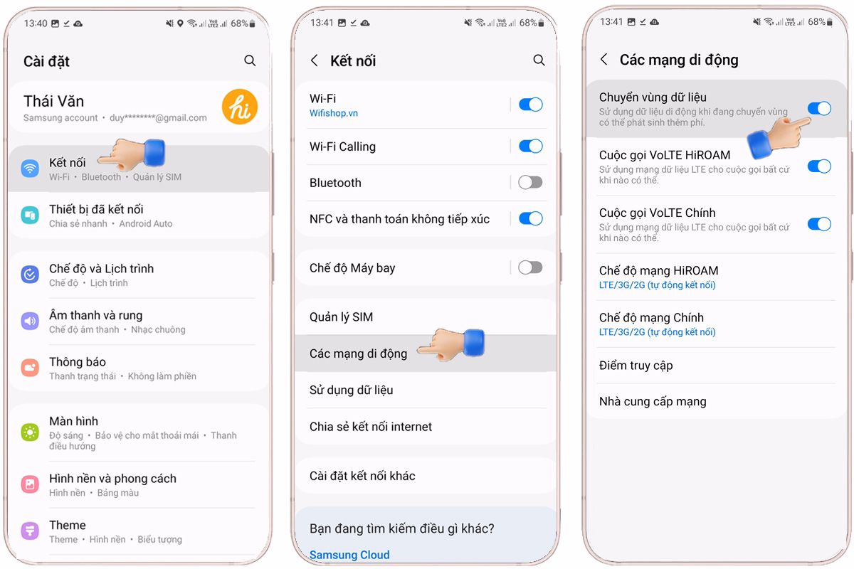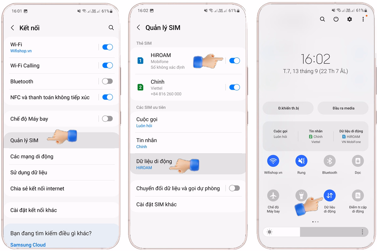 Lắp SIM vào điện thoại → Vào Cài đặt → Kết nối → Quản lý SIM → bật Chuyển vùng dữ liệu để sử dụng. Nếu 2 SIM vào Quản lý SIM → ( bật SIM HiROAM, hoặc sim Chính, Danh Nghiệp tùy bạn đặt tên) → Chọn Dữ liệu Di Động → Chọn SIM HIROAM là sim chính sử dụng dữ liệu. Bật Dữ liệu di dộng để sử dụng.